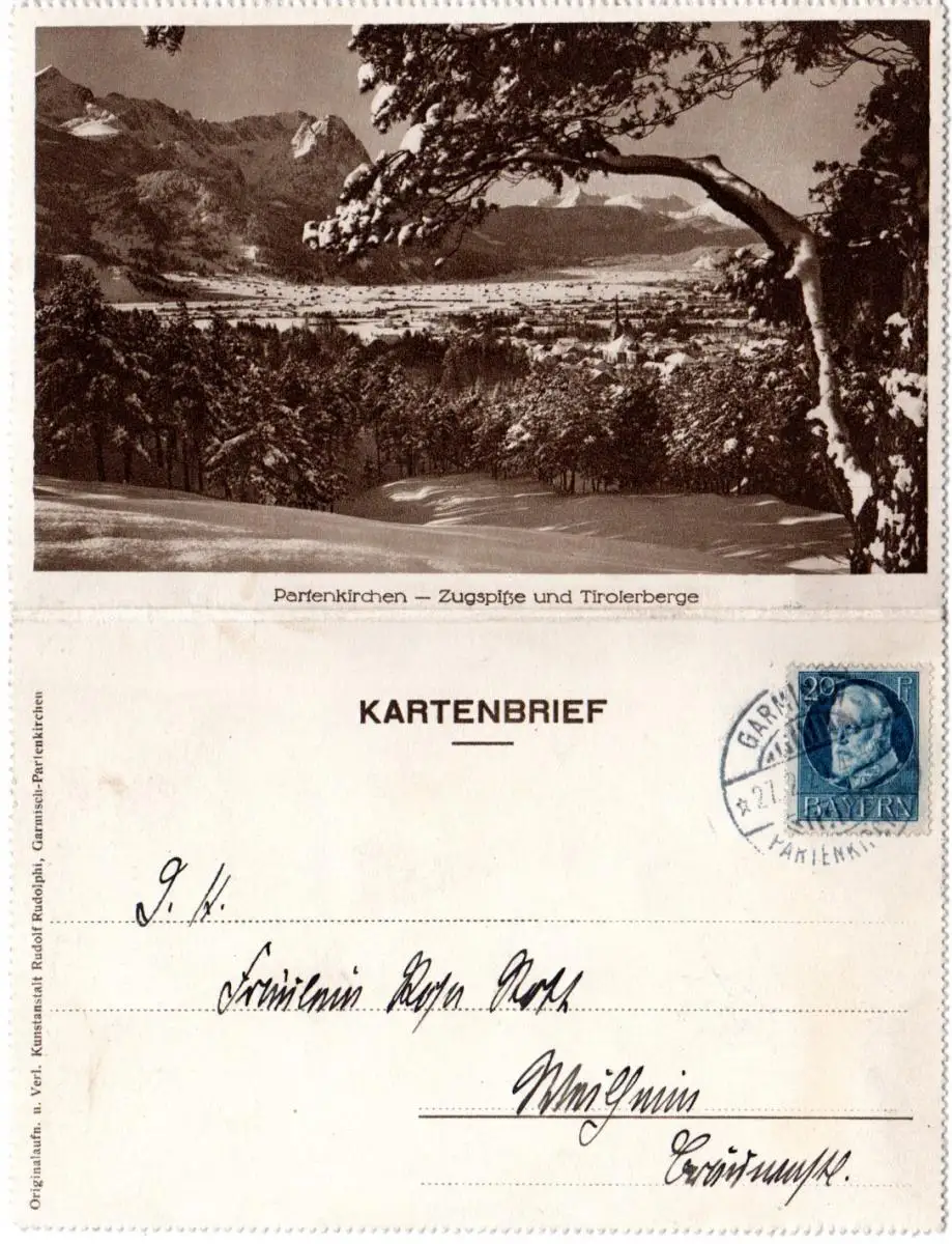 Kartenbrief ab Garmisch-Partenkirchen, gute Erhaltung. Ungewöhnlicher privater Kartenbrief, Verlag Kunstanstalt Rudolf Rudolphi, Garmisch-Partenkirchen.