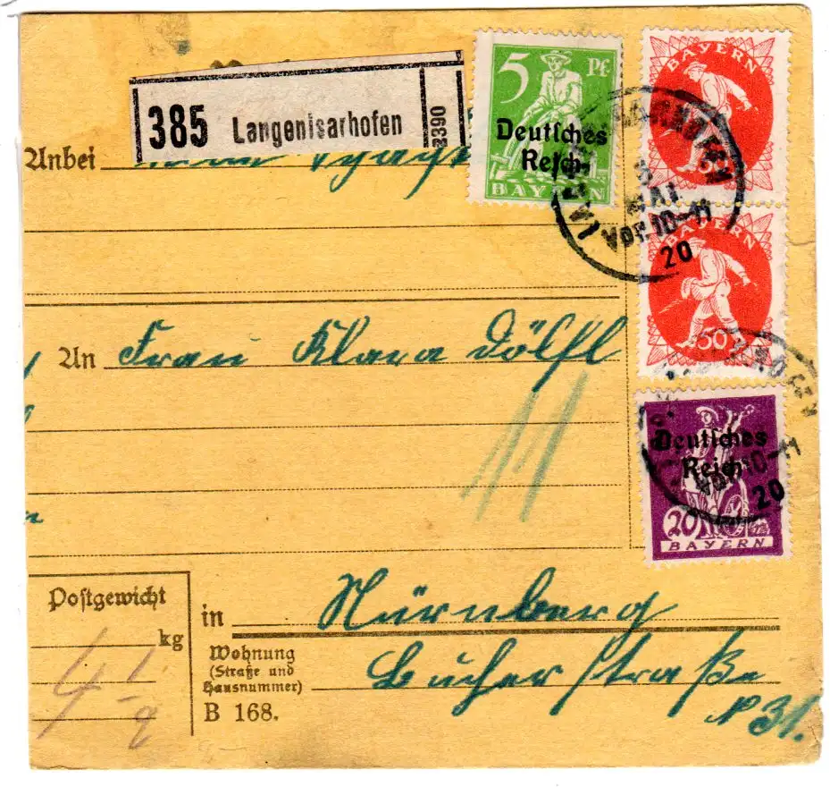 Bayern 1920, 2x50 Pf. Abschied+5+20 Pf. DR auf Paketkarte v. Langenisarhofen