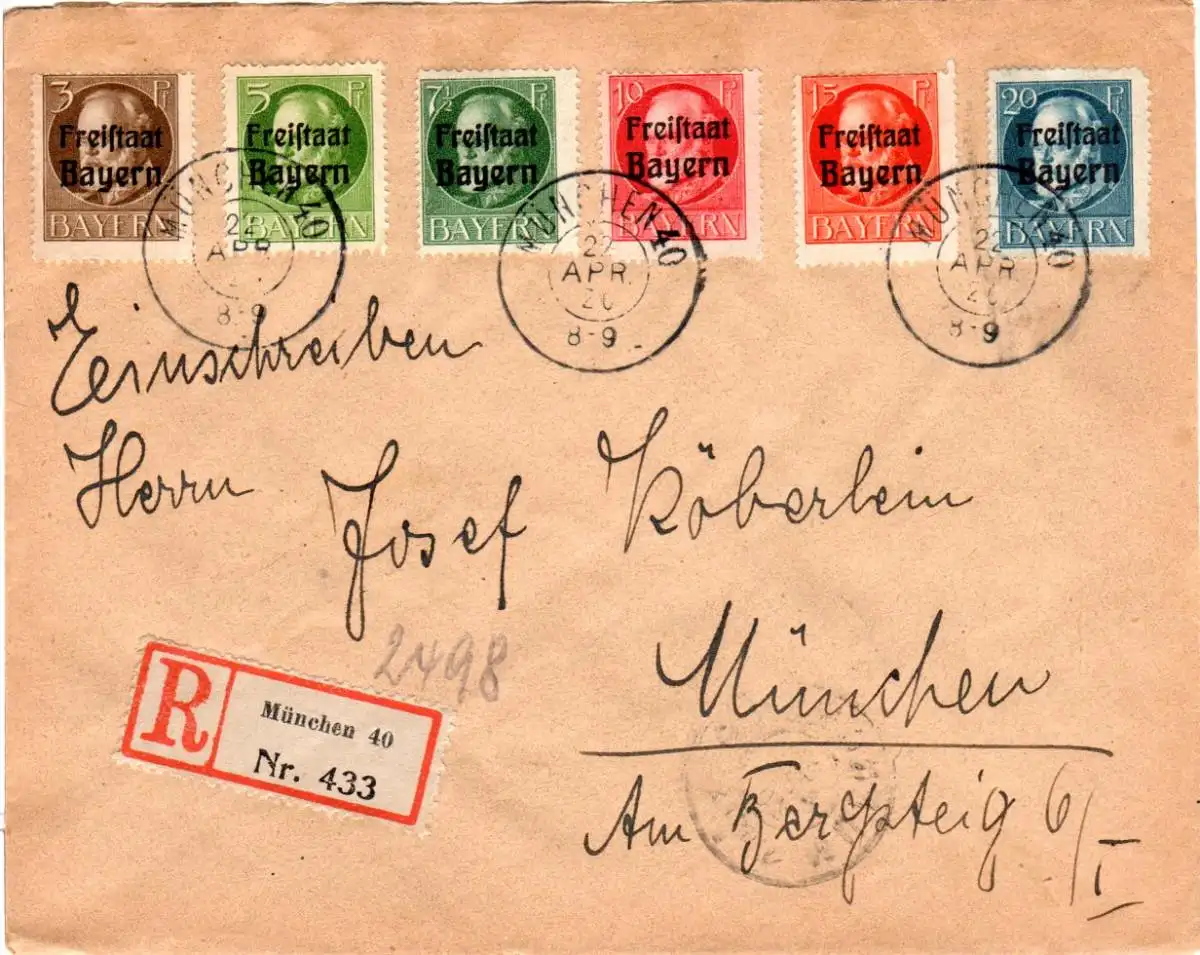 Bayern 1920, 6 versch. Ludwig Freistaat Marken auf Reko Brief v. München 40