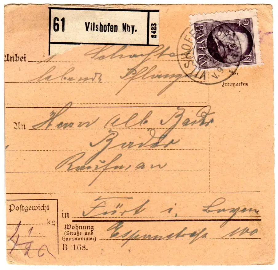 Bayern 1920, EF 2 M. auf Paketkarte v. Vilshofen