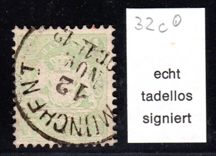 Bayern 32c, 1 Kr. hellgelbgrün m. WZ "weite Welle" u. klarem K1 München. Geprüft