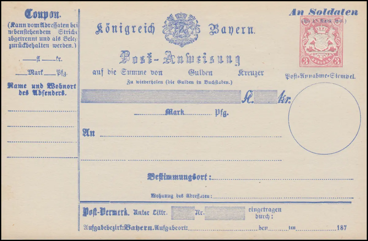 Bayern A 11 II Postanweisung 3 Kreuzer Wappen, mit Zusatz "An Soldaten", **