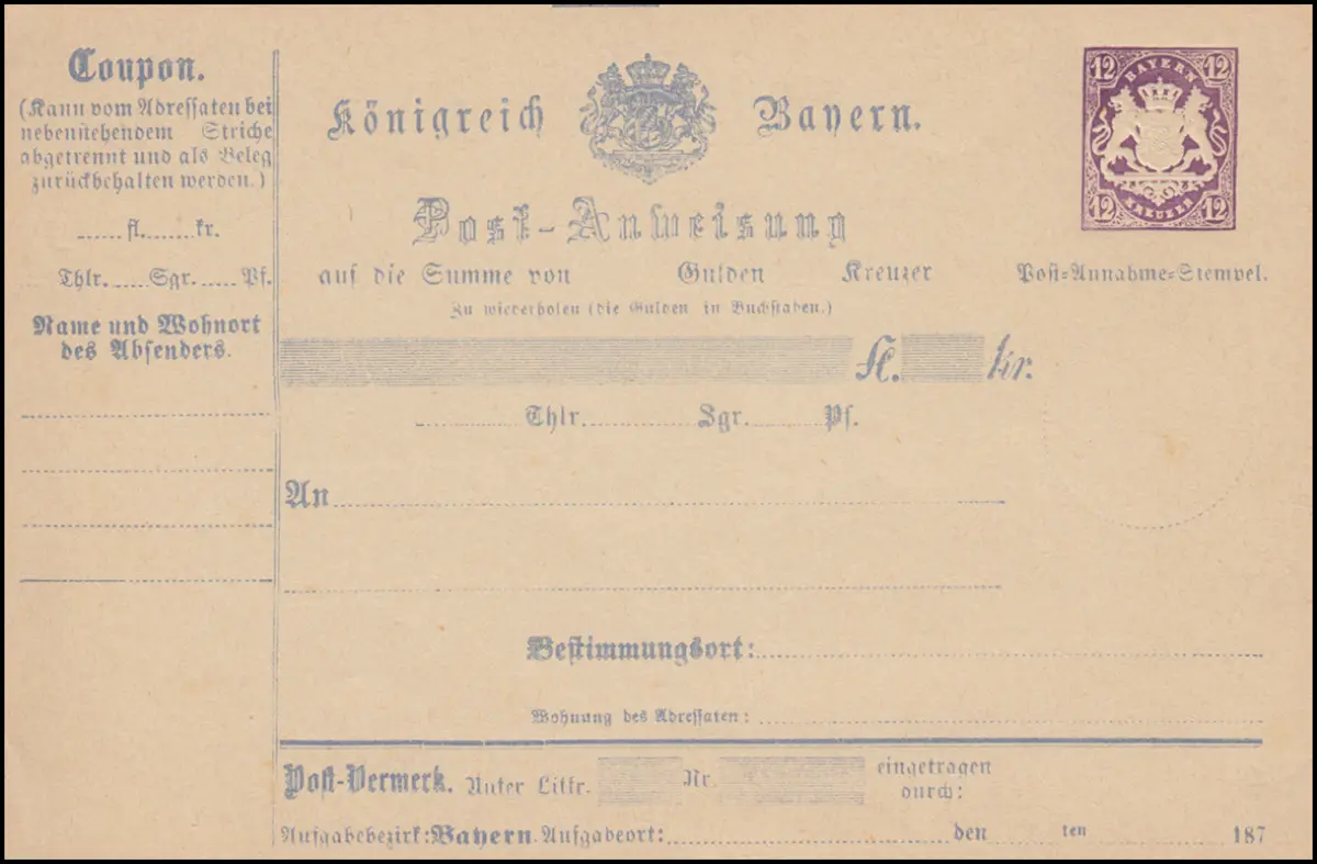 Bayern A 8 I Postanweisung 12 Kreuzer violett Wappen, Type I, postfrisch **