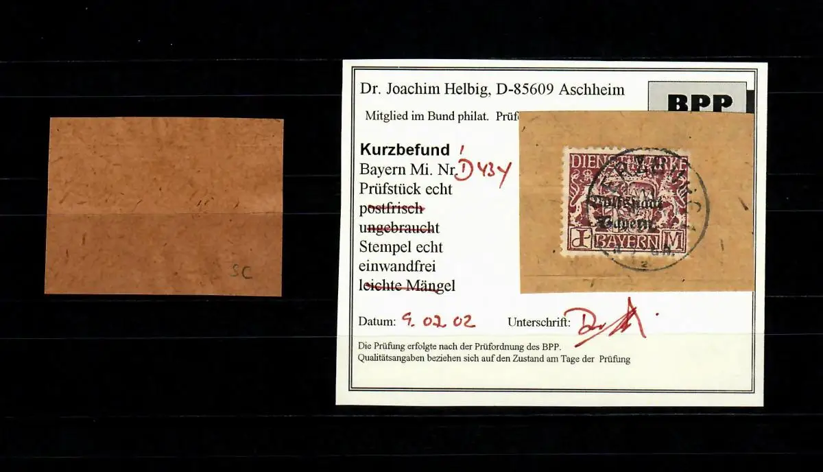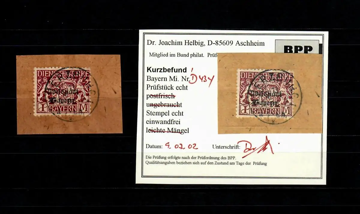 Bayern Dienst MiNr. D 43 y, gestempelt auf Briefstück, BPP Befund