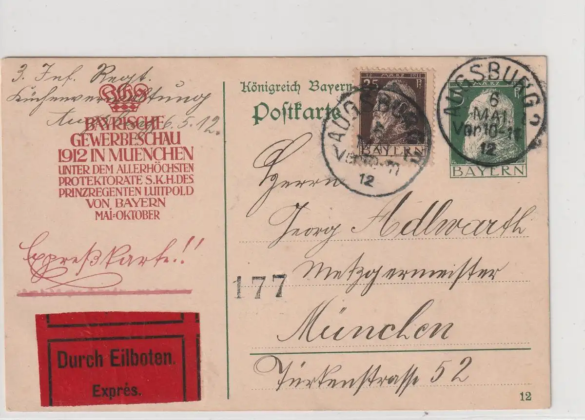 Bayern Eil-Postkarte P92 mit ZuF Nr. 80 in Typ I