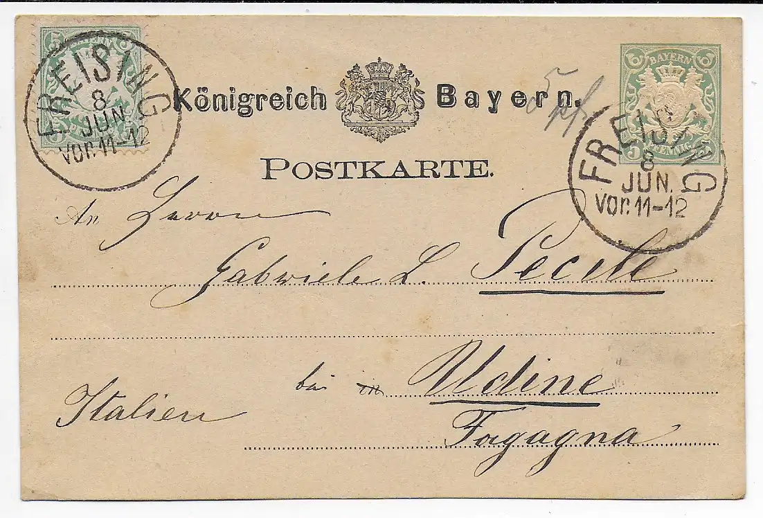 Bayern: Ganzsache von Freising nach Udine, Italien