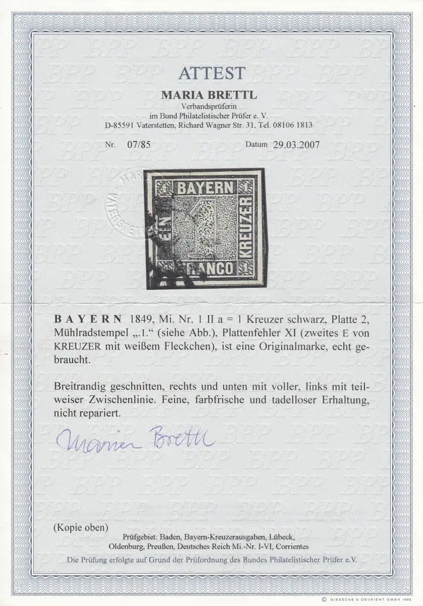 Bayern MiNr. 1 II a Platte 2, PF XI, gestempelt, breitrandig, BPP Attest