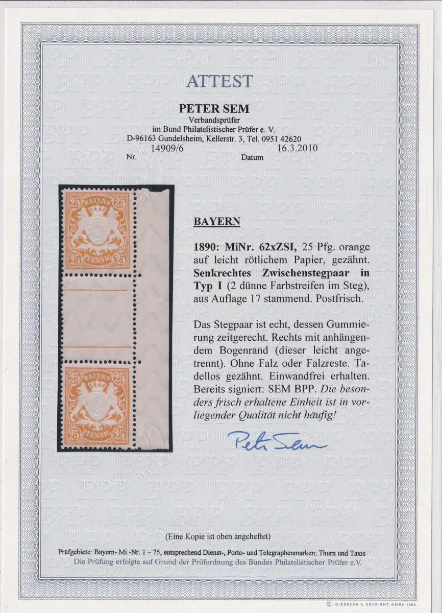 Bayern: MiNr. 62 ZSI, Typ1, **, BPP Attest