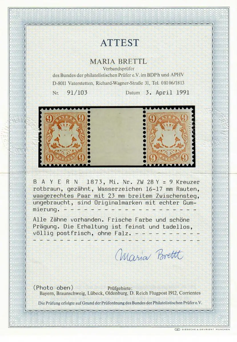 Bayern: MiNr. ZW 28 Y, Zwischensteg, ungebraucht mit Original Gummi, BPP Attest