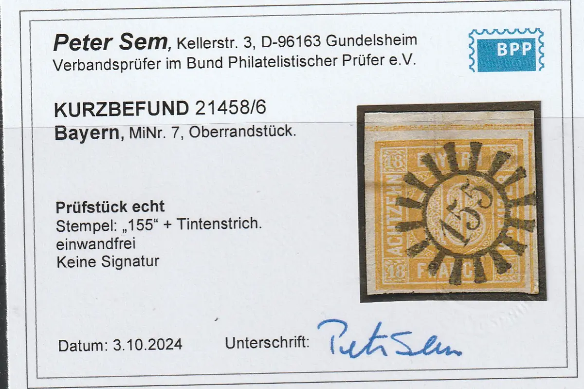 Bayern: Nr. 7 vom Oberrand, zentr. Mühlradstempel 155, Kurzbefund Sem