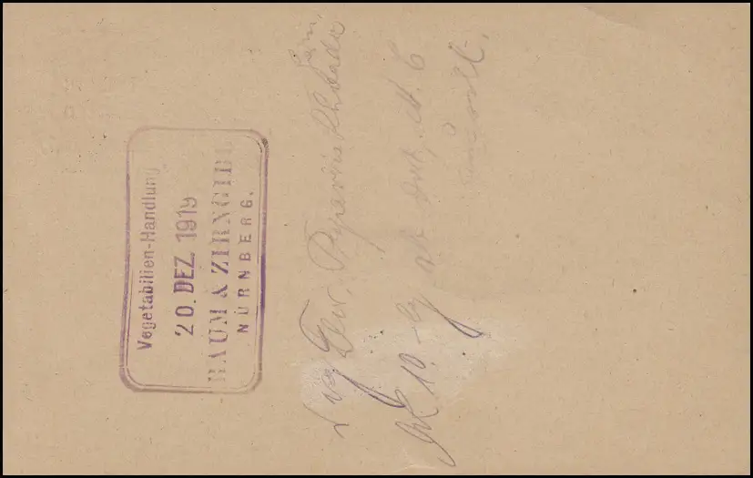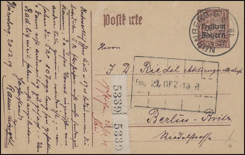 Bayern P 114/01 Freistaat 15 Pf DV 19: Vegetabilien-Handlung NÜRNBERG 20.12.19