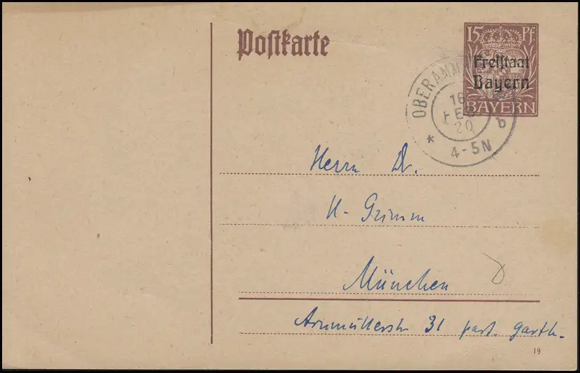 Bayern P 114/I01 Freistaat 15 Pf DV 19: OBERAMMERGAU 16.2.20 nach München