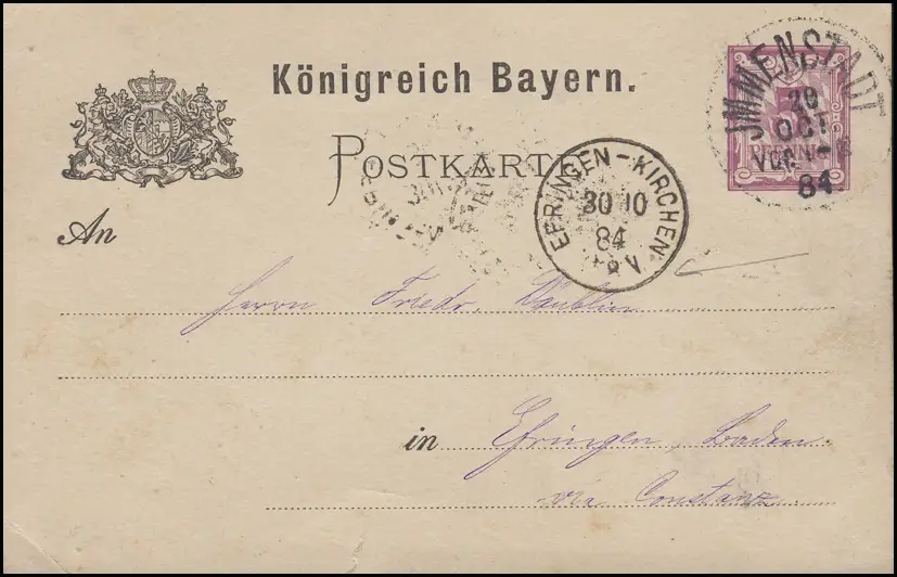 Bayern P 26 Ziffer 5 Pf. WZ.3Z, IMMENSTADT 29.10.84 n. EHRINGEN-KIRCHEN 30.10.84
