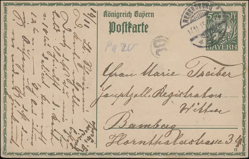 Bayern P 93I/02 Große Krone 5 Pf. DV 15: REGENSBURG 2 - 14.11.15 nach Bamberg