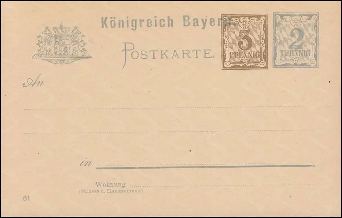 Bayern Postkarte P 72/02 Ziffer 3+2 Pf, DV 01, auf P 55II/01, wie verausgabt **