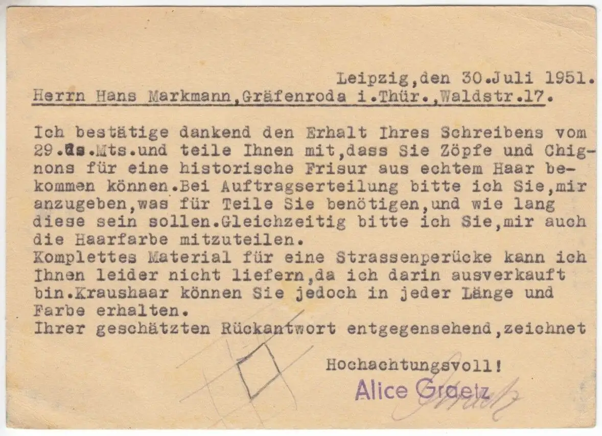 Bedarfspostkarte, DDR Mi.-Nr. 277 Mif 2 x 212 Absender: Alice Graetz, Haarhandlung, Leipzig Empfänger: Privatperson, Gräfenroda Nebenstempel: keine Anmerkungen: Beförderungsspuren Im Inland erfolgt die Zusendung versandkostenfrei als Briefsendung der Deutschen Post AG oder eines privaten Postanbieters. Auslandsversand erfolgt über