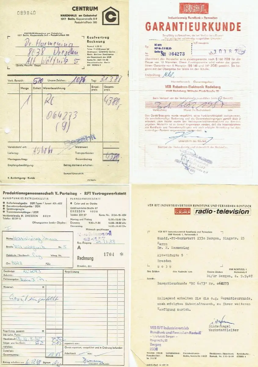 sehr guter Zustand, geringe Gebrauchs- und Alterungsspuren: Rechnung, Garantieurkunde und Anschreiben teils etwas knittrig, Aufstellung - Anschluß - Einstellung und Bedienung - Störungen - technische Daten Beilagen: Vertragswerkstättenverzeichnis - Kaufvertrag Centrum Warenhaus am Ostbahnhof in Berlin - 2 Schaltpläne (Blatt 1+2) - Briefumschlag und Schreiben von der Werkstatt in Bergen auf Rügen - Rechnung der Werkstatt in Dresden - Garantieurkunde, Papier, ca. 21 x 15, 8 Seiten mit 2 Bildern + 8 Beilagen