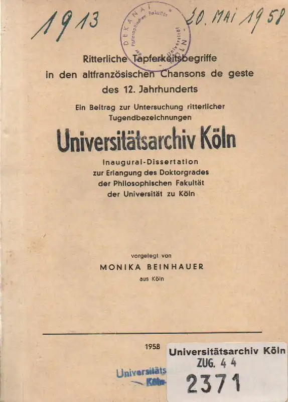 Titel: Ritterliche Tapferkeitsbegriffe in den altfranzösischen Chansons de geste des 12. Jahrhunderts: ein Beitrag zur Untersuchung ritterlicher Tugendbezeichnungen. (Dissertation)