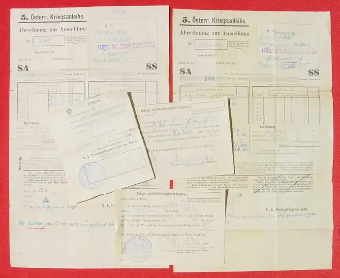 Neu : Versandkosten ab Euro 2,20 (2001540) Kleine Partie von 5 Belegen : a) 2 grosse ausgefüllte Formulare der Kriegsanleihen-Zeichnungsstelle für die 5. Österr. Kriegsanleihe über je 600 Kronen von 1917. b) 3 Einzahlungsquittungen für 5. u. 6....