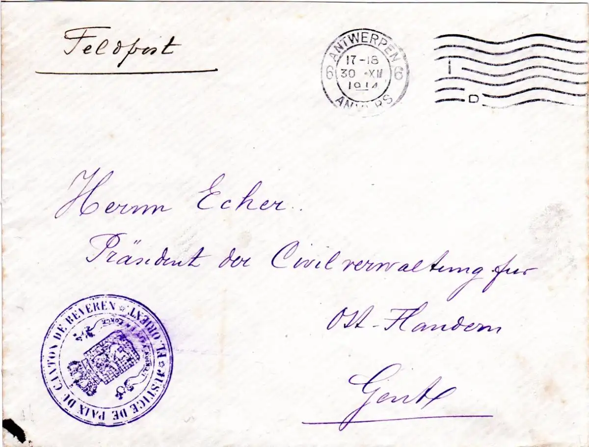 Belgien 1914. Feldpost Brief v. Antwerpen m. Briefstempel Justice De Paix