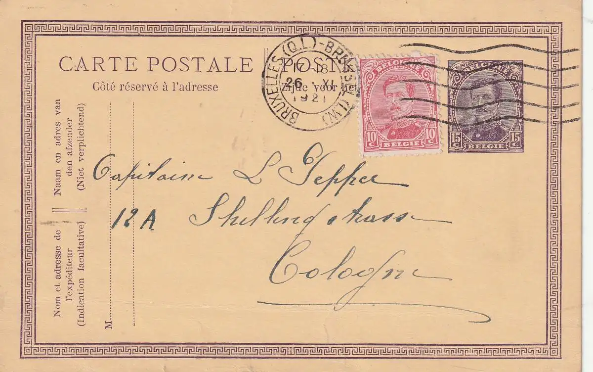 BELGIEN - 1921, Ganzsache Michel P76 mit Zusatzfrankatur 10 cent nach Köln