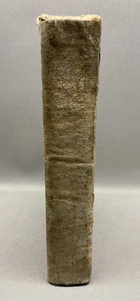 Einband stärker bestoßen, wurmlöchrig und hinterer Deckel mit Eckabriss und unsachgemäßer Klebung. Schmutzbll. und Titel gestempelt, Papier gering gebräunt und bis Seite 42 ein wenig feuchtrandig