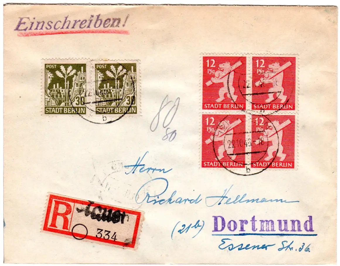 Allierte Besetzung Berlin u. Brandenburg, 6 Marken auf portorichtigem R-Brief (21-40 Gramm) v. Nauen n. Dortmund. Ank.Stpl. rückseitig. Reko-Zettel m. eingestempeltem Orts-L1.