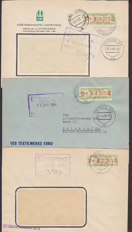 Berlin 3 Bfe mit ZKD-Streifen, vorschriftsmäßig sammelunwüdig gemacht, Textilwerke EBRO