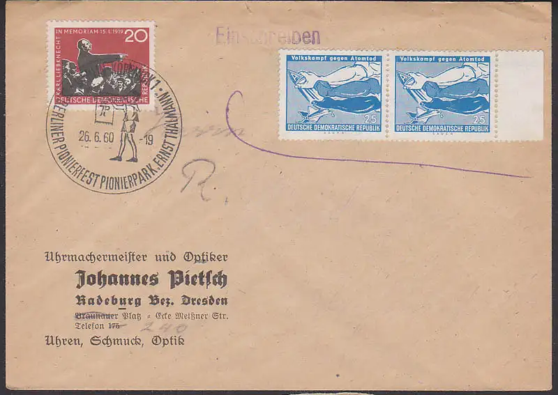 Berlin-Köpenick, Standardbf, da SoMkn Volkskampf gegen Atomtod ungültig, seltener SSt.Pionierfest 26.6.60