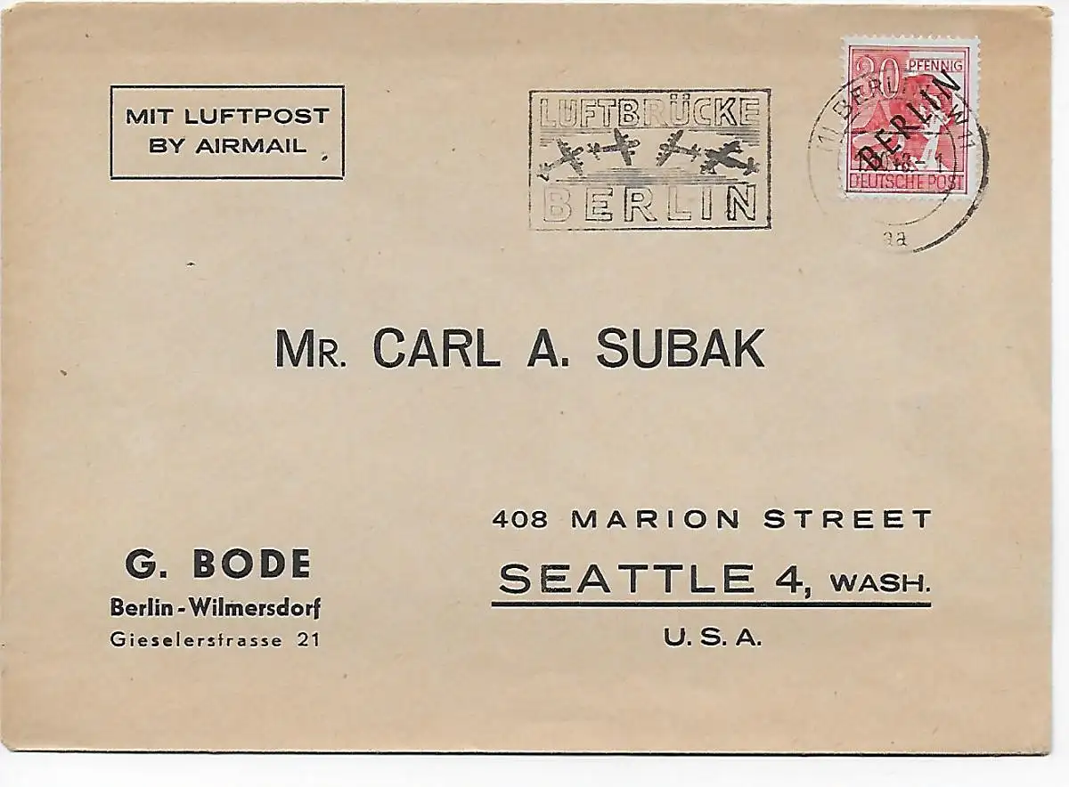 Berlin Luftbrücke Werbestempel 1948 nach USA-Seattle/Wash.