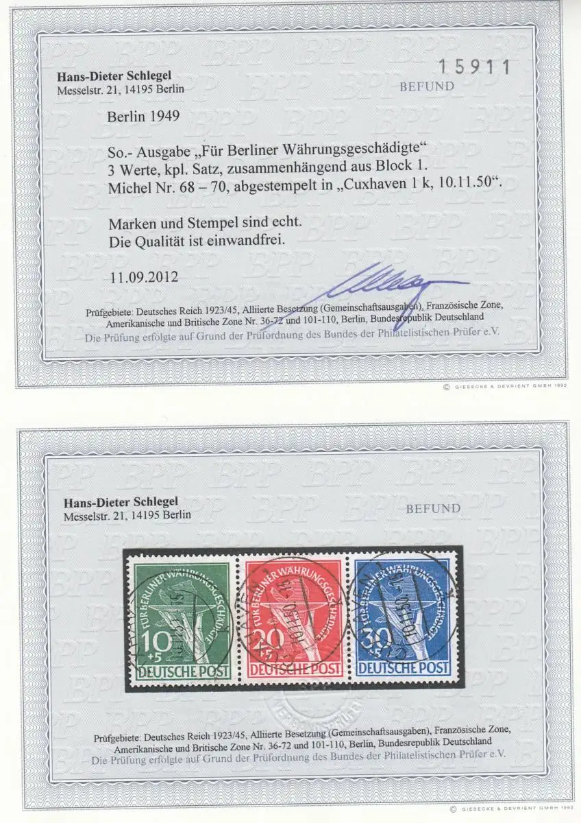 Berlin MiNr. 68-70, gestempelt Cuxhaven 1950, BPP Befund