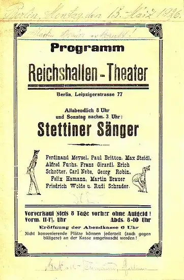 Titel: Programm Reichshallen - Theater, Berlin, Leipziger Straße 77. Programm der Stettiner Sänger (Ferdinand Meysel, Paul Britton, Alfred Fuchs, Max Steidl, Franz Girardi, Erich Schröter, Carl Nebe, Georg Robin, Felix Hamann, Martin Brauer, Friedrich Wolde, Rudi Schrader). Programm vom 15. März 1926 u.a. mit dem musikalischen Genrebild 'Klavierlehrer Schultze' und lebende Studenten-Lieder 'Deutschland erwache' und der Burleske 'Mutter uff Reisen' von Ferdinand Meysel