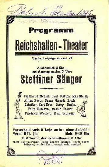 Berlin Reichshallentheater. - Stettiner Sänger: Programm Reichshallen - Theater, Berlin, Leipziger Straße 77. Programm der Stettiner Sänger (Ferdinand Meysel, Paul Britton, Alfred Fuchs, Max Steidl, Franz Girardi, Erich Schröter, Carl Nebe, Georg Robin, F