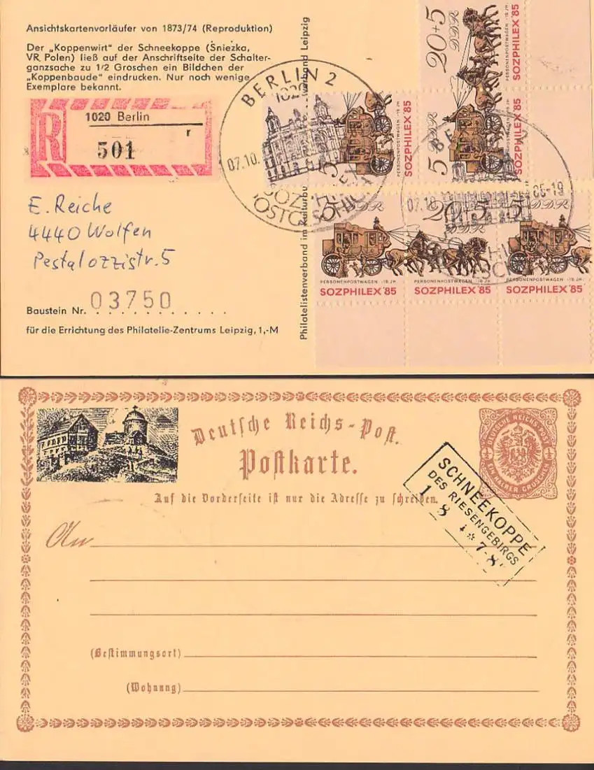 Berlin SOZPHILEX 85 Zdr. auf Bausteinkarte portogenaues Einschreiben, Ak Schneekoppe Sniezka (2964)