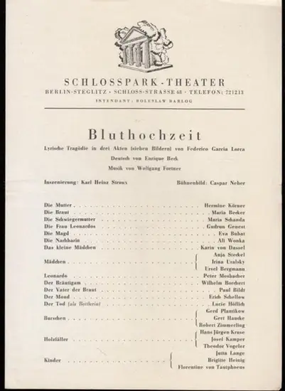 Berlin. - Schlossparktheater. - Boleslaw Barlog (Intendanz). - Federicio Garcia Lorca: Bluthochzeit. Programmzettel. Inszenierung: Karl Heinz Stoux, mit u. a.: Hermine Körner, Maria Becker, Gudrun Genest, Peter Mosbacher, Wilhelm Borchert, Erich Schellow,