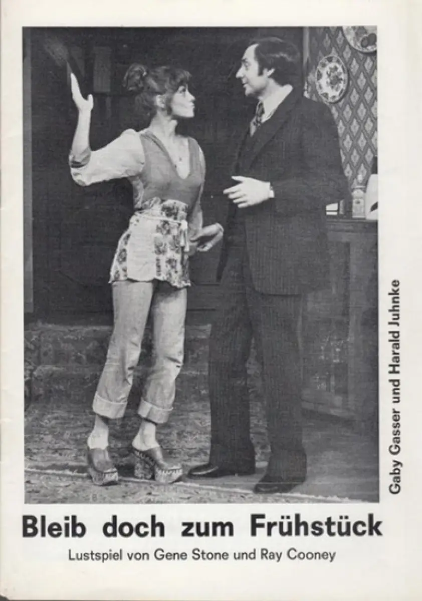 Titel: Bleib doch zum Frühstück. Spielzeit 1974 / 1976. Direktion Hans, Christian und Wölffer, Jürgen. Regie Spier, Wolfgang. Bühne Fleischer, Gerd B. Darsteller Juhnke, Harald / Gasser, Gaby / Gerlach, Dieter B