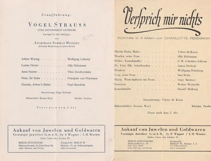 Aus dem Inhalt: "Versprich mir nichts" von Charlotte Rissmann. Insz.: Viktor de Kowa, mit u.a.: Viktor de Kowa, Olly Holzmann, Susi Deitz, Anton Herbert, F. W. Schröder-Schrom. // URAUFFÜRUNG:"Vogel Strauss" von Archibald Norman Menzies. Insz.: Hugo Schrader, mit u.a.: Wolfgang Lukschy, Olly Holzmann, Paul Henckels, Friedjelm von Petersson. // Ankündigungen. // Werbung. //.