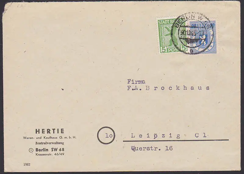 Berlin W66 Fernbrief mit 5 und 20 Pfg. Bärenausgabe nach Leipzig