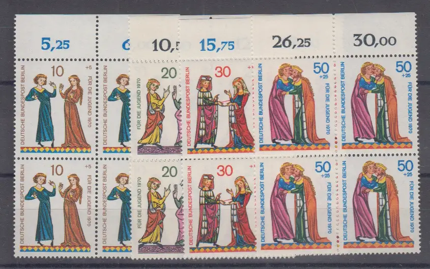 Berlin Für die Jugend 1970 MiNo. 354/57 ** in OR-4er-Blocks , dabei 354 PF I : N in Berlin gebrochen