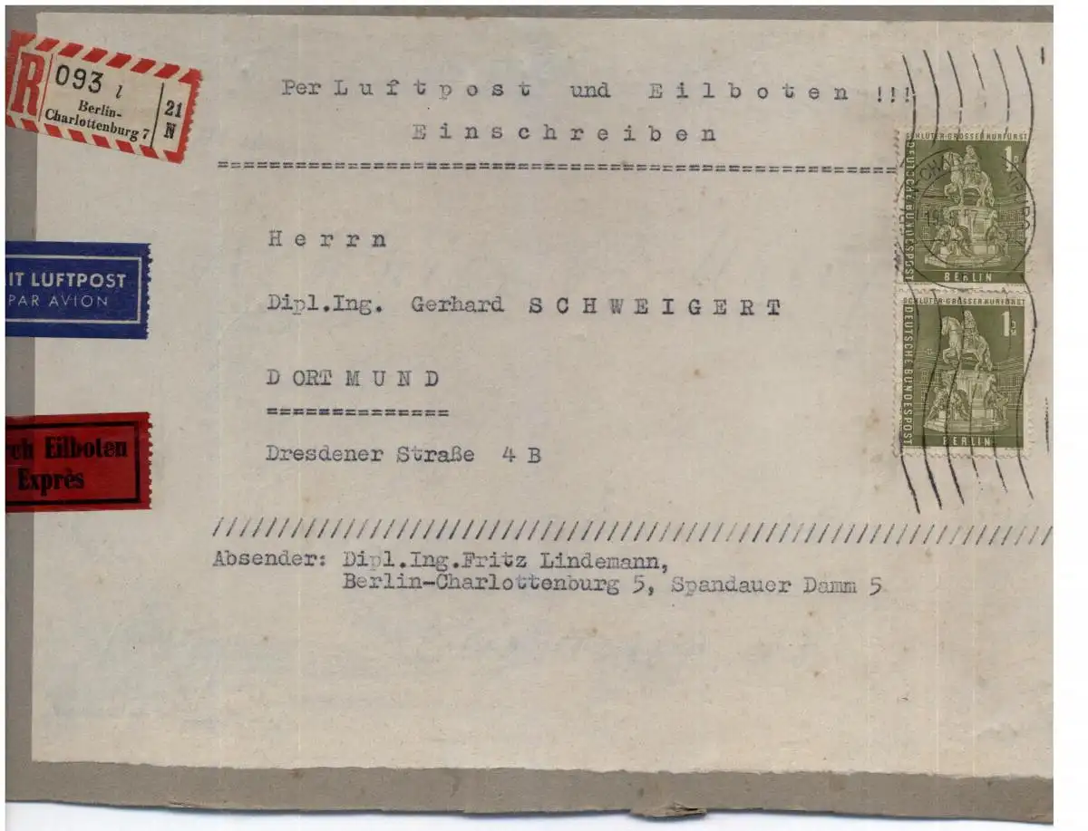BERLIN - 1949 (1957), Michel 57, 1,- DM DC 4 Mehrfachfrankatur auf Briefvorderseite, Einschreiben Luftpost Eilboten von Charlottenburg nach Dortmund, Katalogpreis 430,-