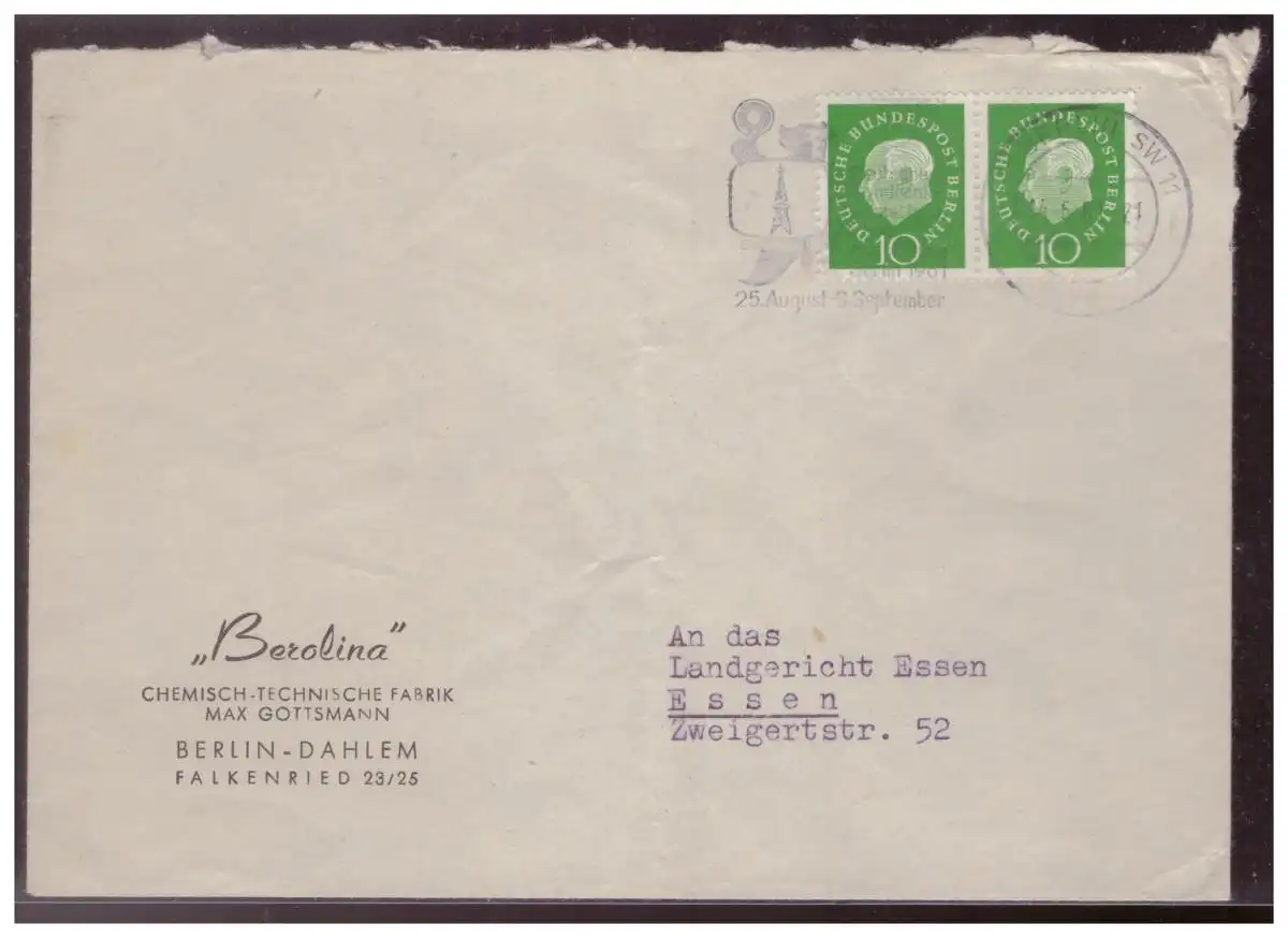 Berlin (008489) Firmenbrief Berolina waagrechtes Paar MNR 183 gelaufen von Berlin zum Landgericht Essen am 14.6.1961
