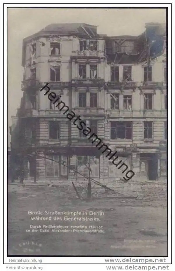 Grosse Strassenkämpfe in Berlin während des Generalstreiks - Durch Artilleriefeuer zerstörte Häuser an der Ecke Alexander- Prenzlauerstrasse - Original-Aufnahme Angef. Photochemie Berlin (E988)