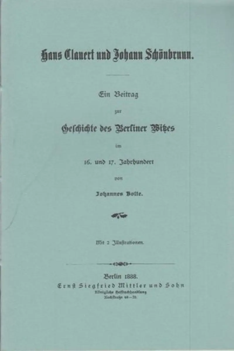 Titel: Hans Clauert und Johann Schönbrunn. Ein Beitrag zur Geschichte des Berliner Witzes im 16. und 17. Jahrhundert. (Berlin-Archiv, herausgegeben von Hans-Werner Klünner und Helmut Börsch-Supan)