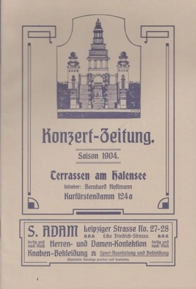 Titel: Konzert-Zeitung [ Konzertzeitung ]. Saison 1904. Terrassen am Halensee. (Berlin-Archiv, hrsg.v. Hans-Werner Klünner und Helmut Börsch-Supan)