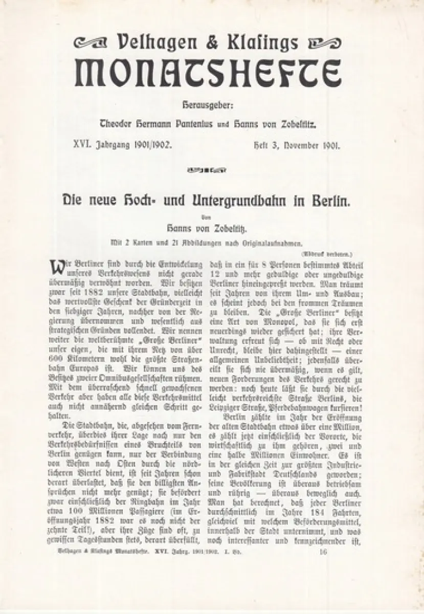 BerlinArchiv herausgegeben von Hans-Werner Klünner und Helmut Börsch-Supan. - Zobeltitz, Hanns von (Aut.): Die neue Hoch- und Untergrundbahn in Berlin. Velhagen & Klasings Monatshefte, XVI. Jahrg. 1901/02, Heft 3, Nov. 1901. (Berlin-Archiv, hrsg.v. Hans-
