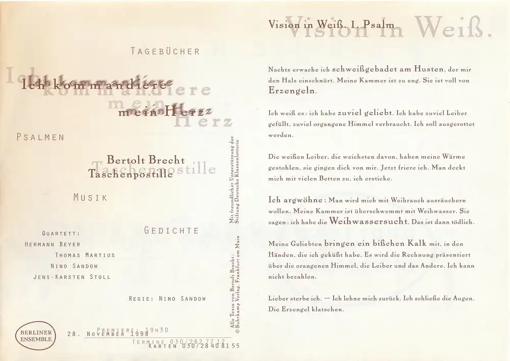 Titel: Programmheft ICH KOMMANDIERE MEIN HERZ Bertolt Brecht Taschenpostille Premiere 28. November 1998
