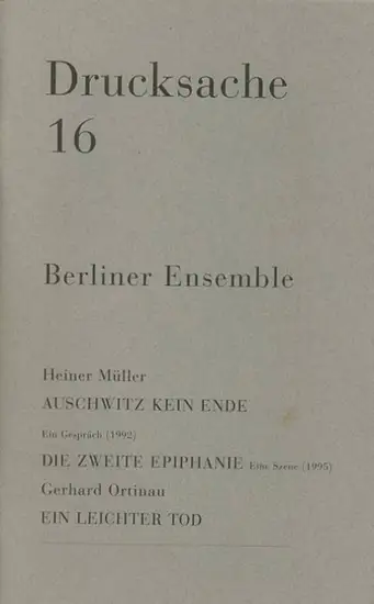 Berliner Ensemble. Teschke, Holger und Müller, Heiner: Drucksache 16. Berliner Ensemble. Aus dem Inhalt: ERSTVERÖFFENTLICHUNG Heiner Müller: Vi die zweite Epiphanie. / ERSTVERÖFFENTLICHUNG Heiner Müller: Auschwitz kein Ende- Ein Gespräch mit jungen franzö