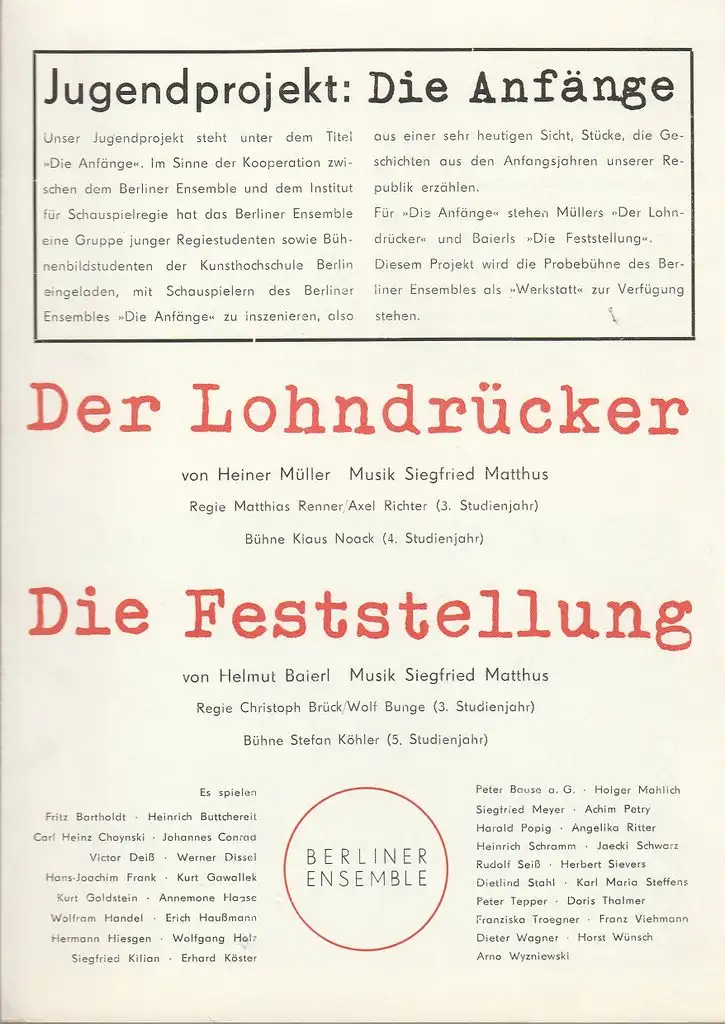 Berliner Ensemble: Werbeflyer Heiner Müller DER LOHNDRÜCKER / Helmut Baierl DIE FESTSTELLUNG.