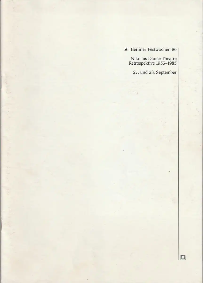 Nicolai Dance Theatre. Choreographie, Kostüme, Licht, Musik und Leitung: Almin Nikolais. Programm: 27. September 19 Uhr und 28. September 14.30 Uhr: TENSILE INVOLVEMENT: Musik: Alwin Nikolais. Mitwirkende: Ensemble. NOUMENON: Musik: Alwin Nikolais. Mitwirkende: Lynn Lesniak / Timothy Harling / james Murphy. VIDEO GAME: Musik: David Gregory. Mitwirkende: Ensemble. CONTACT: Mitwirkende: Alwine Nikolais. Mitwirkende: Ensemble, Solo: Raul Trijillo, Duett Tim Harling / James Murphy. CRUCIBLE: Musik: Alwin Nikolais. Mitwirkende: Ensemble. THE MRCHANICAL ORGAN: Musik: Alwin Nikolais und David Darling. Sieben verschiedene Tänze. Mitwirkende: Ensemble, u. a. Programm: 28. September 19.30 Uhr: KALEIDOSCOPE: Musik: arangiert von Alwin Nikolais. Mitwirkende: Ensemble, u. a. CANTOS: Musik: Alwin Nikolais. Mitwirkende: Ensemble. COUNT DOWN: Mitwirkende: Alwin Nikolais. Mitwirkende: Ensemble. EXCERPT FROM ARPORISMS: Musik: Alwin Nikolais. Mitwirkende: Ensemble, u. a. - Theaterprogramm, Opernprogramm, Ballettprogramm, Musicalprogramm, Konzertprogramm, Theatermemorabilia, Programmhefte Sammlung, deutsche Theatergeschichte.