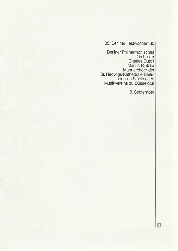 Titel: Programmheft Berliner Philharmonisches Orchester Charles Dutoit, Marius Rintzler, Männerchöre 8. September 35. Berliner Festwochen 1985